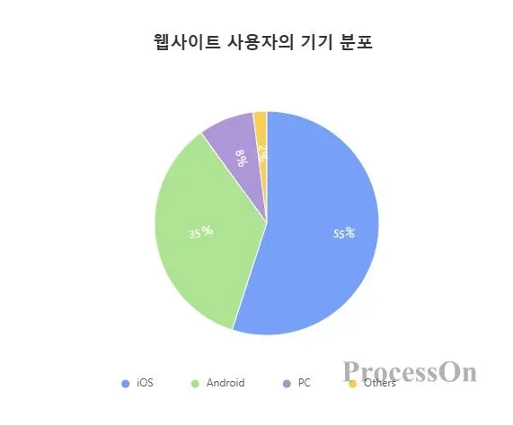 디스플레이 웹사이트 이용자 기기 분포 : iOS(55%), Android(35%), PC(8%), 기타(2%)