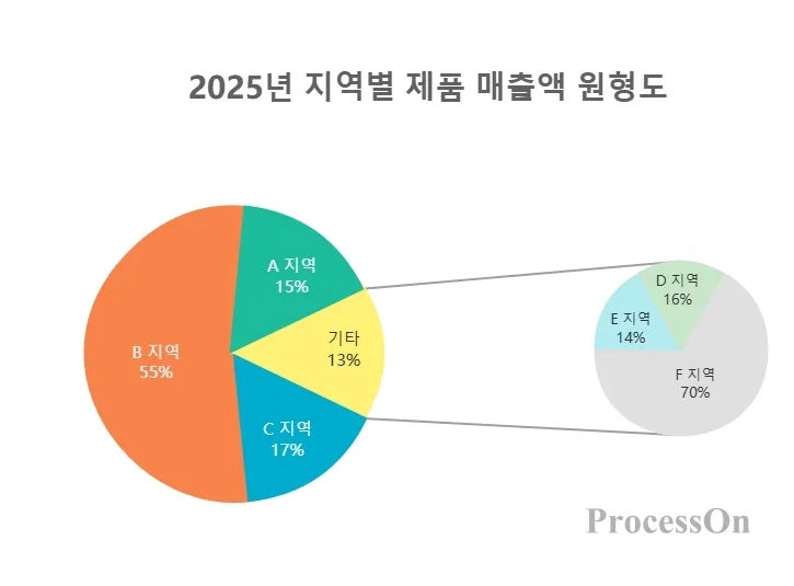 특징: 너무 많은 카테고리로 인해 너무 작은 부문 영역이 생기는 문제를 효과적으로 해결하여, 독자가 전반적인 일반 구성을 이해하는 동시에 특정 중요 카테고리에 대한 자세한 분석도 탐구할 수 있도록 해줍니다. 계층적 데이터를 표시하는 데 자주 사용됩니다. 예를 들어, 회사의 전반적인 수익 구조를 표시할 때 주요 원형 차트는 전체 수익에서 다양한 사업 부서가 차지하는 비율을 보여주고, 보조 원형 차트는 특정 주요 사업 부서 산하의 다양한 제품군이 차지하는 수익 비율을 보여줍니다.