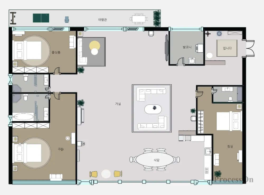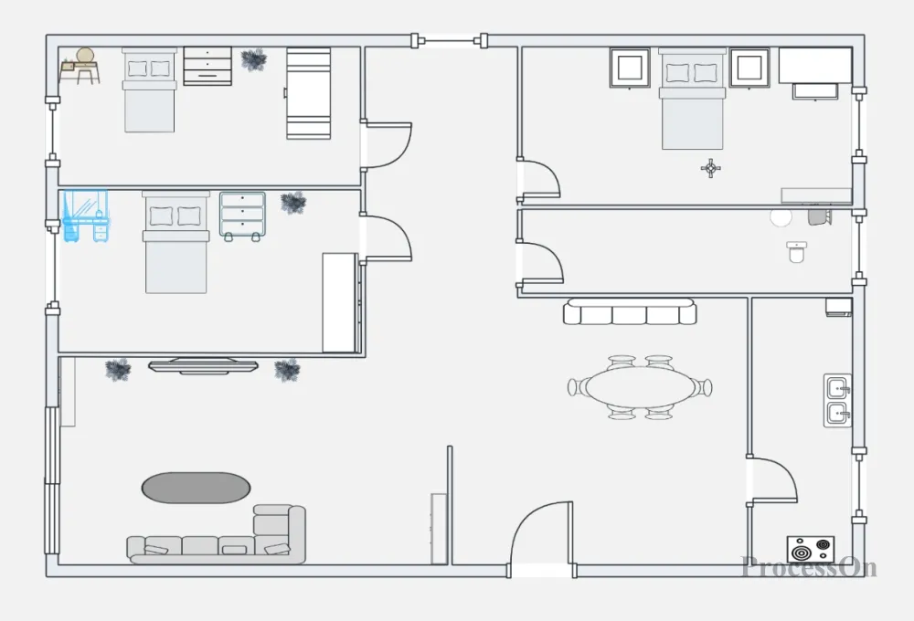 집의 디자인과 배치에 대한 자신만의 아이디어가 있다면, 이 도구를 사용하여 간단한 평면도를 디자인할 수 있습니다. 다음은 ProcessOn 흐름도의 평면도 그래픽을 사용하여 설계된 침실 2개짜리 평면도입니다. 사용에 대한 임계값이 낮으므로 별다른 학습이나 업그레이드 없이도 이상적인 주택 디자인을 그릴 수 있습니다.