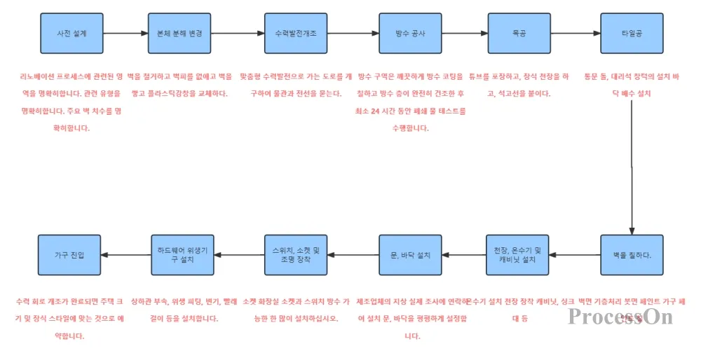 시공 순서에 주의하세요: 장식 공정의 순서대로 시공하세요. 즉, 철거 및 개조, 수도 및 전기 공사, 목공, 석고 작업, 설치 등의 단계를 포함합니다.