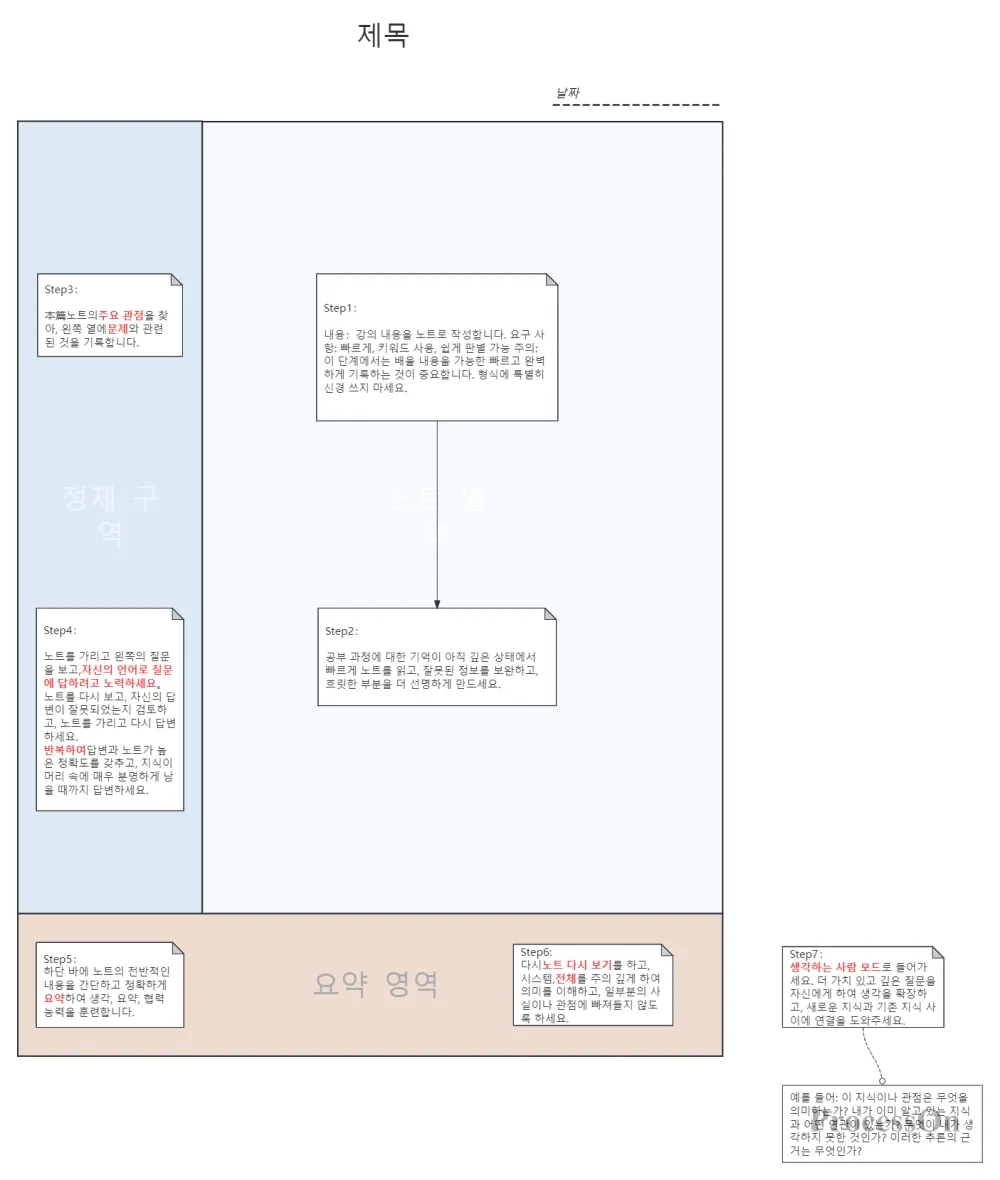 메모를 정기적으로 검토하세요. 특히 왼쪽 영역의 키워드와 하단 영역의 요약을 검토하세요. 반복적인 검토와 통합을 통해 단기 기억을 장기 기억으로 전환합니다.