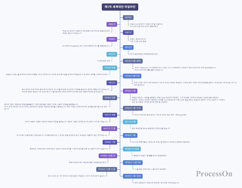 마인드맵으로 타임라인을 그리는 것의 장점은 간단하고 효율적이라는 점입니다. 마인드맵 편집기에서는 타임라인의 구조가 고정되어 있으므로 단축키만 사용하면 별도의 작업 없이 다단계 타임라인 노드를 연속적으로 만들 수 있습니다. 과도한 조판.