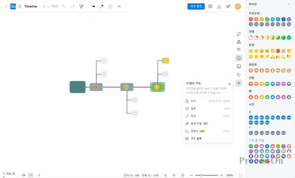 ProcessOn의 마인드 맵 또는 순서도는 그리기 타임라인을 지원합니다. 마인드맵에는 타임라인 구조가 내장되어 있어 작업이 더욱 편리해집니다. 텍스트와 주요 정보만 입력하면 됩니다. 흐름도 그리기 타임라인은 더 자유로우며 보다 개인화된 편집 요구 사항을 지원합니다.