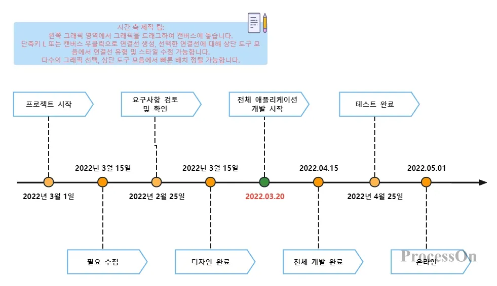 위의 글을 읽으신 후 타임라인의 개념과 작도에 대해 매우 깊은 이해를 가지셨으리라 믿습니다. 타임라인 만들기를 직접 경험해 보시기 바랍니다! → ProcessOn으로 이동하여 타임라인을 그립니다 .