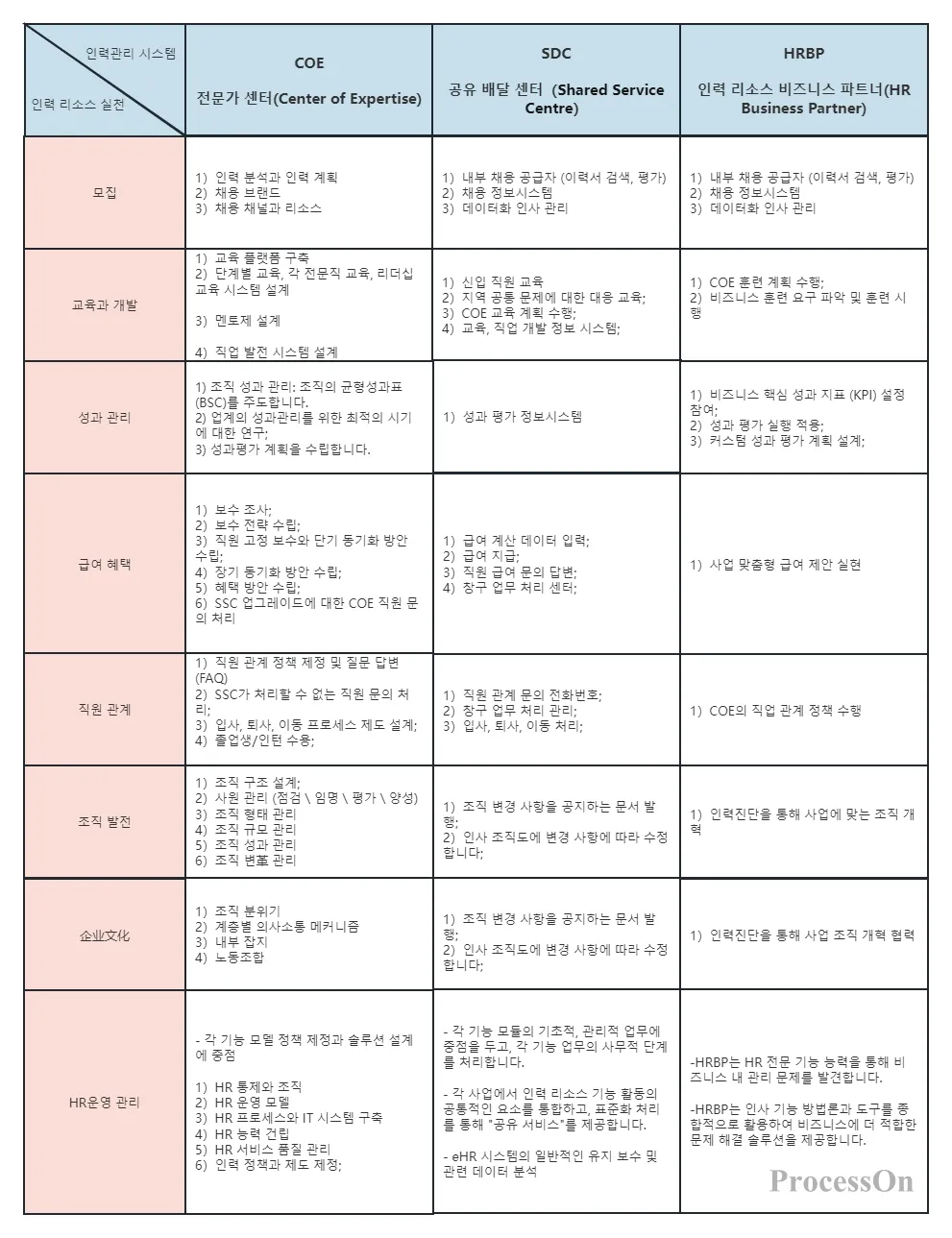 조직설계 측면에서 레이아웃 및 입지선정은 그룹의 규모, 사업형태, 산업분포 등을 고려하여야 하며, 입지선정 기준인 4차원, 16요소를 준수하여야 한다. 내부 구조는 직원 콜센터와 HR 프로세스 거래 처리 센터로 구성됩니다. 처리 센터의 프로세스 구조는 HR 프로세스, 사업 단위 또는 지역에 따라 모듈로 나눌 수 있으며 운영 관리 센터도 구축됩니다.