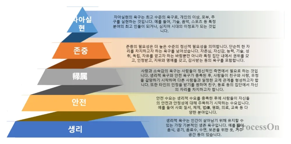 매슬로의 욕구 단계 이론은 1943년 미국의 심리학자 에이브러햄 매슬로가 제안했습니다. 이 이론은 인간의 욕구를 기본에서 고급까지 생리적 욕구, 안전의 욕구, 사회적 욕구, 존중의 욕구, 자아실현의 욕구 등 5단계로 구분합니다. 마슬로는 이 5가지 단계 간의 관계를 직관적으로 표현하기 위해 피라미드 다이어그램을 사용했는데, 여기서 생리적 욕구는 피라미드의 맨 아래에 위치하여 가장 기본적인 욕구임을 나타내고, 자아 실현의 욕구는 피라미드의 맨 위에 위치하여 가장 높은 수준의 욕구임을 나타냅니다.