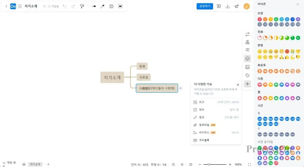3. 캔버스 오른쪽에 있는 도구 모음을 클릭하면 자기 소개를 위한 보충 지침으로 아이콘, 라벨, 그림, 메모 및 기타 요소를 주제에 삽입할 수 있습니다.
