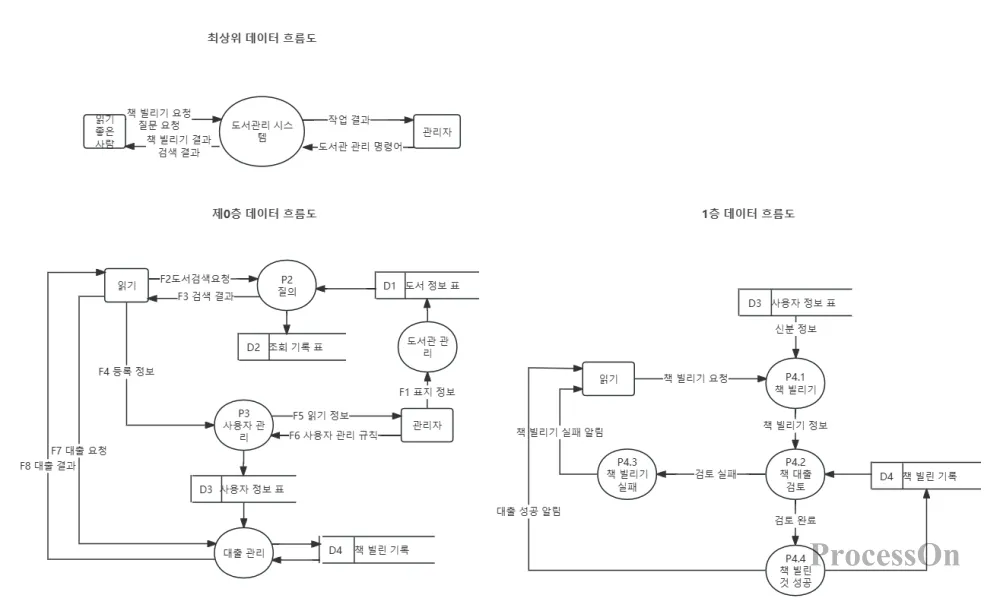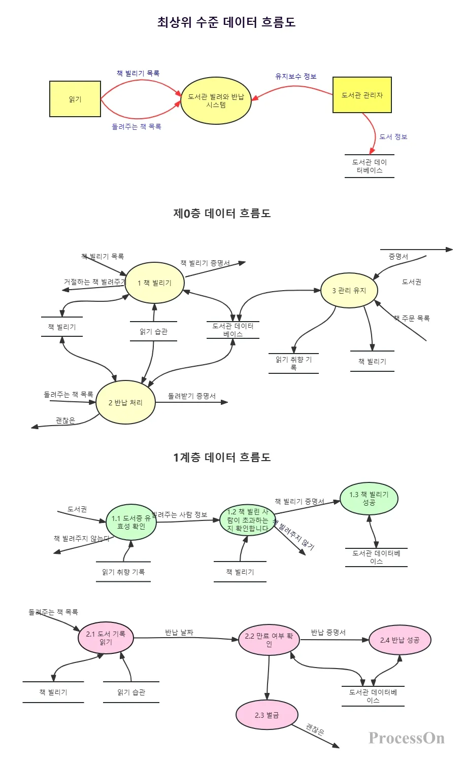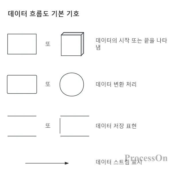 외부 엔터티: 사용자, 다른 시스템, 데이터 소스 등 시스템 외부 요소를 나타냅니다. 이는 데이터의 소스 또는 대상입니다.