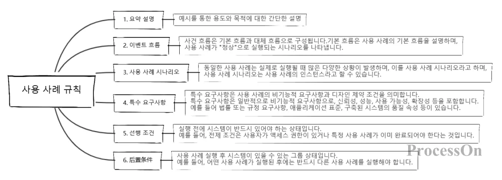 각 사용 사례는 특정 작업 또는 상호 작용 프로세스를 설명하고 기본 프로세스, 대체 프로세스 및 이벤트 흐름을 통한 예외 처리를 자세히 설명합니다.