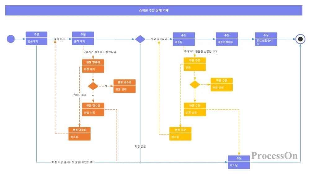 전자상거래: 주문의 생성부터 완료까지 다양한 상태를 표시합니다.