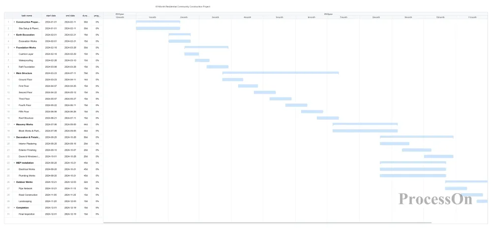 AI가 생성한 간트 차트는 명확한 작업 계층 구조, 합리적인 시간 계획, 주요 프로세스 간의 명확한 종속성을 보여주므로 프로젝트 관리자는 이를 건설 조직 설계 및 진행 상황 관리에 직접 활용할 수 있습니다.