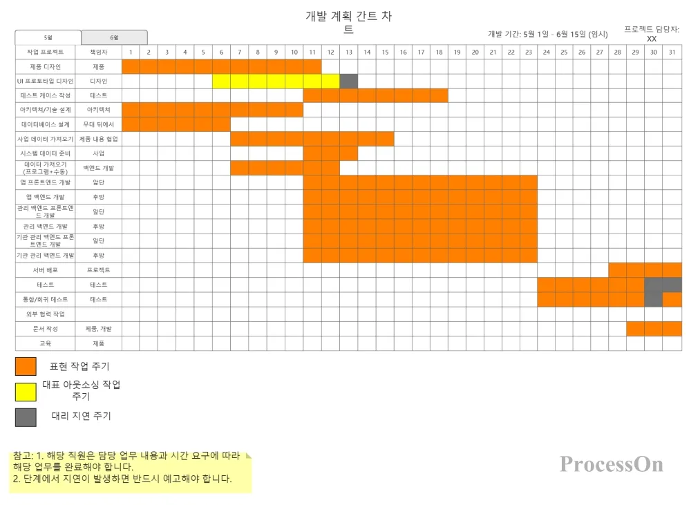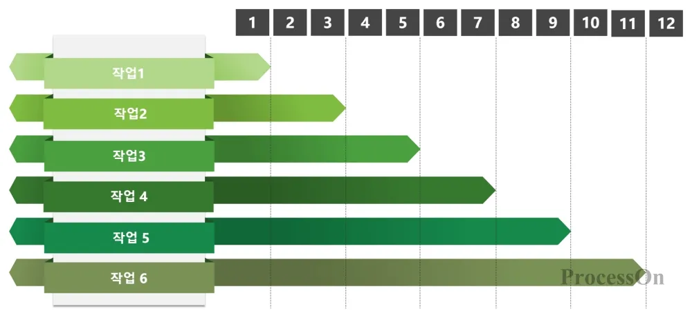 5. 간트차트 조정 : 그린 후 프로젝트 진행 상황에 따라 언제든지 변경 및 조정이 가능합니다.