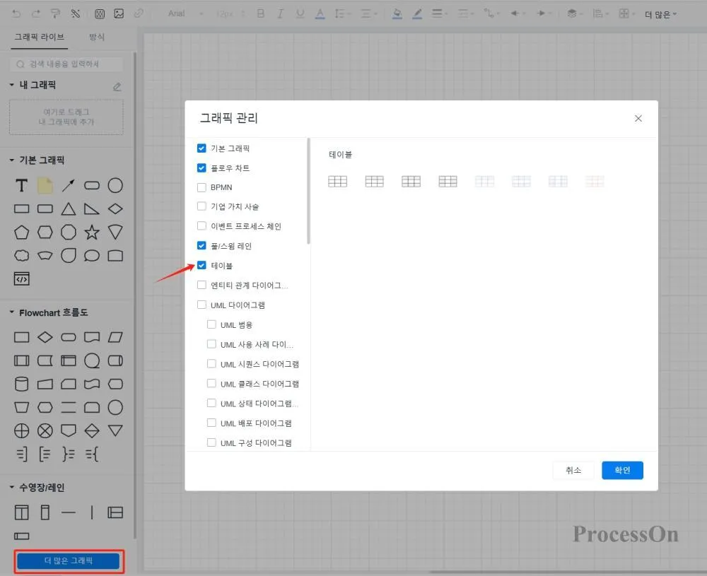 생성한 후 툴바 왼쪽 하단의 [추가 그래픽] 버튼을 클릭 하고 [ Table] 그래픽 구성 요소를 도구 모음에 추가합니다.