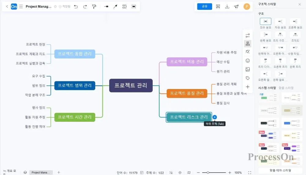 3. 노드를 선택하고 상단 도구 모음을 사용하여 노드와 텍스트의 색상과 크기 , 그리고 브랜치의 두께와 색상을 필요에 따라 조정하여 차트의 가독성과 미학성을 향상합니다.