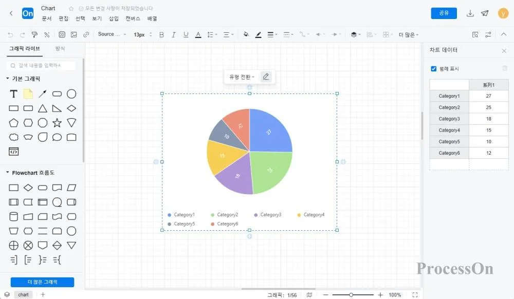 2. 왼쪽 그래픽 라이브러리에서 [추가 그래픽]을 클릭하고 [차트]를 선택한 후 [확인]을 클릭합니다.