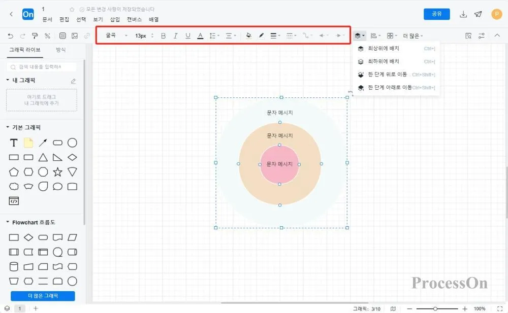 원을 선택하고 어니언 다이어그램의 코어 레이어, 중간 레이어, 외부 레이어 간의 관계에 따라 상단 도구 모음에서 다양한 레벨을 설정합니다. 또한 색상, 글꼴 및 기타 스타일 조정도 지원합니다 .