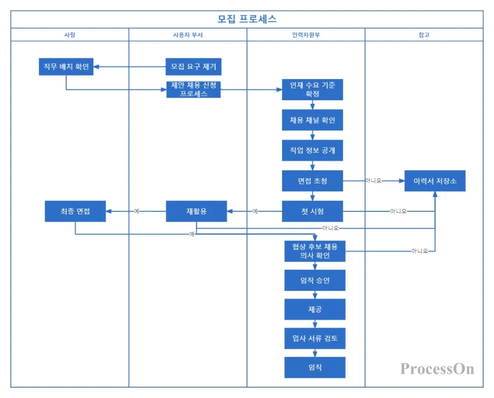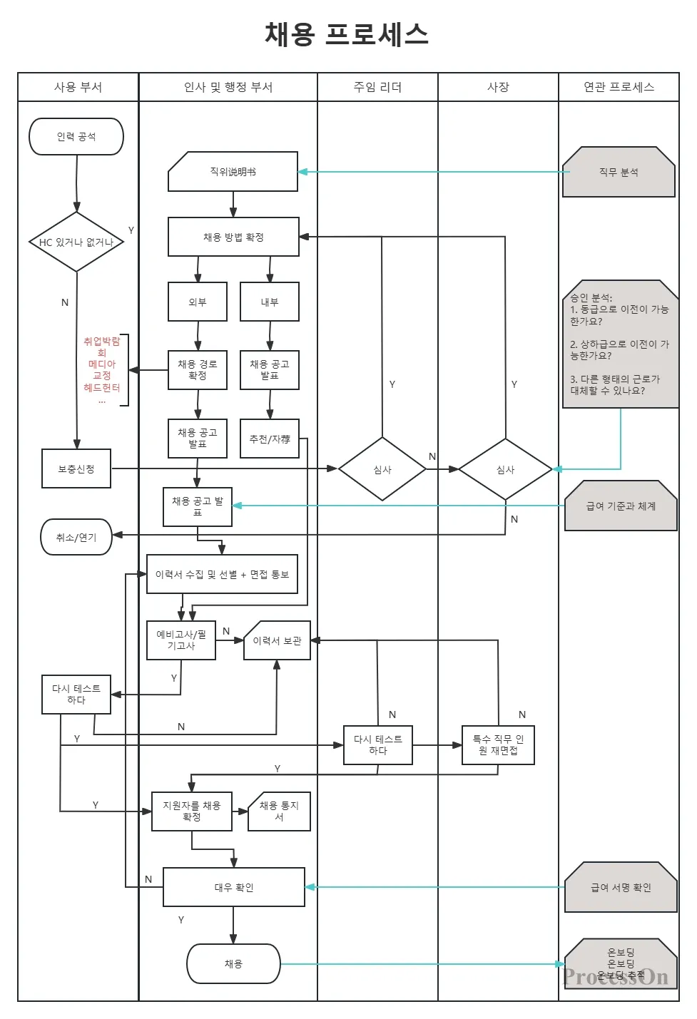 전체 콘텐츠를 보려면 로그인하세요 이 플로차트는 채용 과정을 체계적으로 설명하는 도구로, 인재 채용의 각 단계를 명확히 보여줍니다. 채용 과정은 채용 채널 확인에서 시작하여 모집 요