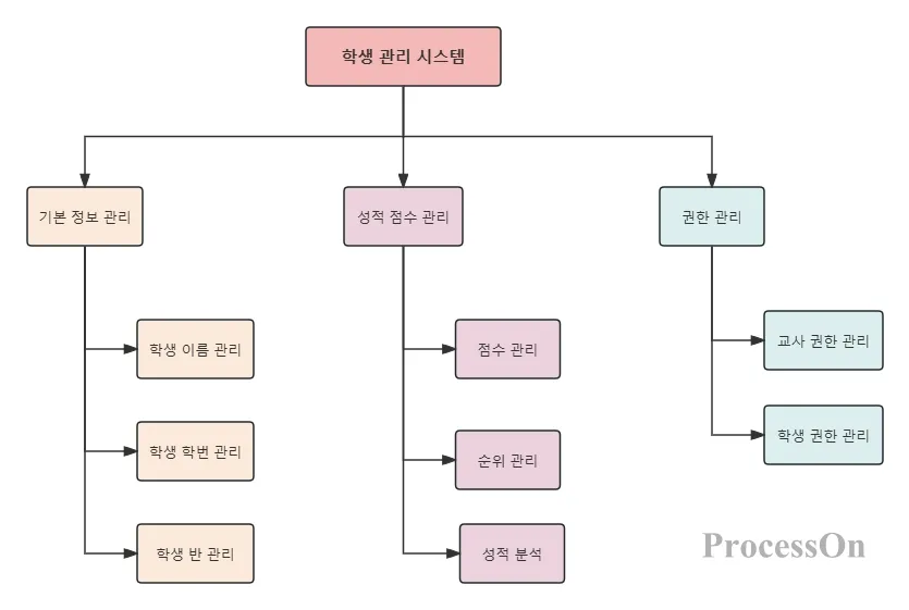 각 기능 모듈은 더욱 구체적인 하위 모듈로 분해될 수 있습니다. 예를 들어, 기본 정보 관리는 학생 이름 관리, 학생 번호 관리, 수업 관리 등으로 세분화될 수 있습니다.